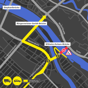 Der motorisierte Verkehr - Pkw und Lkw ebenso wie die Fahrzeuge des Personennahverkehrs - wird für die Dauer der Arbeiten bis zu den frühen Morgenstunden des Montags, 10. November 2025, über die Bürgermeister-Smidt-Brücke umgeleitet. Entsprechende Umleitungsbeschilderungen werden rechtzeitig aufgestellt.